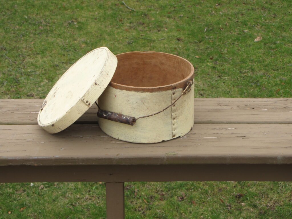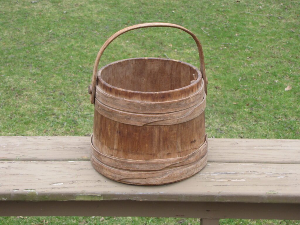 18th century staved bucket with bentwood handle with wooden buttons and buttonhole bands. Price $395.00