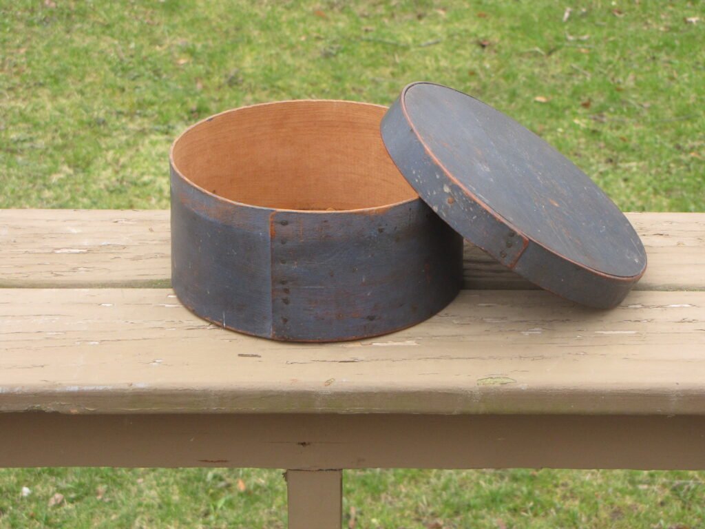 Nice 19th century pantry box in original blue painted surface, seams are tight and the box is in fine condition dimensions 8 ¾” diameter and 4 ½” high. Price $350.00