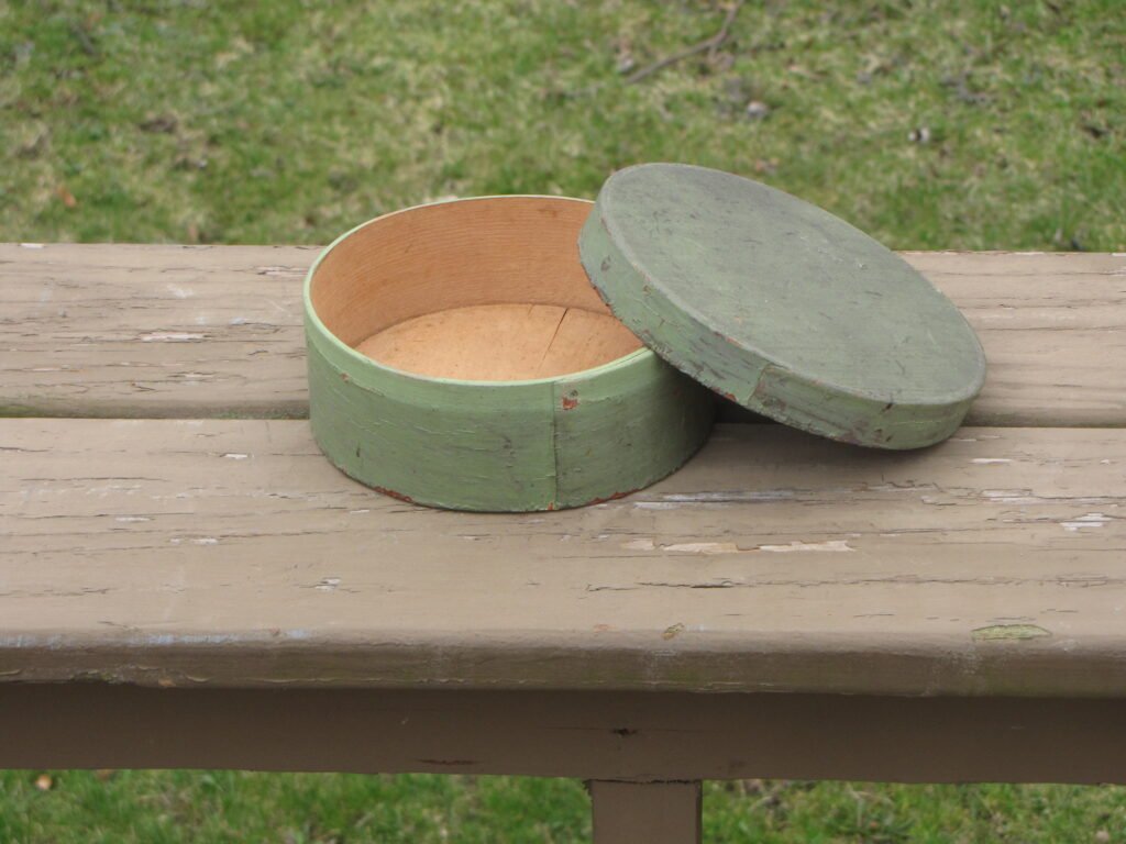 Early 19th century pantry box in apple green paint over the original red , seams are tight with no cracks or damage to the box dimension 6 ½” diameter and 2 ½” high Price $325.0