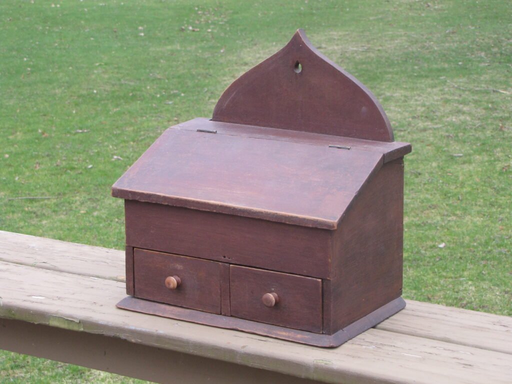 19th century candle box in original red painted surface with lift top and two drawers, small square nails dimensions 14” wide 15” high and 9”deep. Price $595.00
